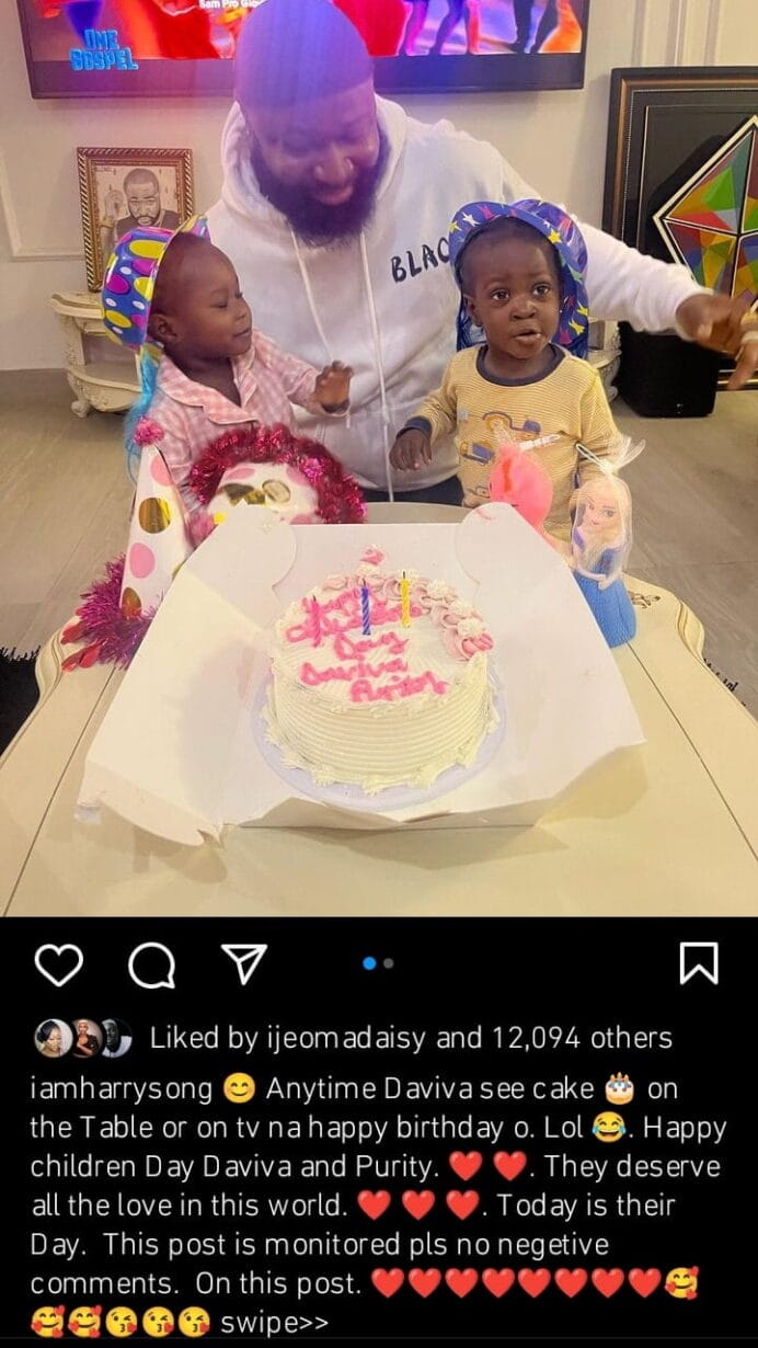 “Anytime Daviva see cake on the table or TV, na happy birthday o. Lol, Happy Children’s Day Daviva and Purity. They deserve all the love in this world. Today is their day. This post is monitored, pls no negative comments on this post”.