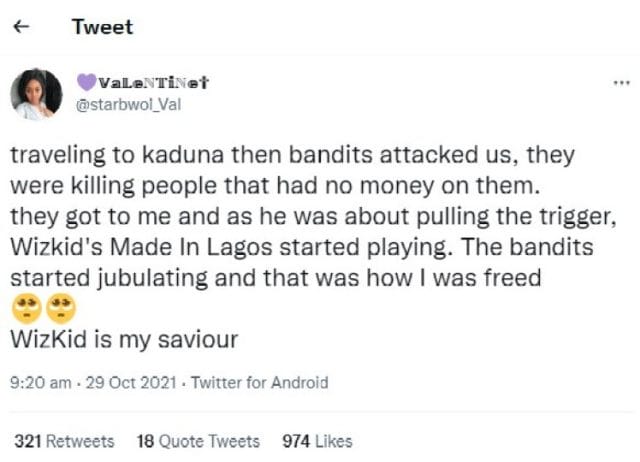@starbwoi_Val wrote; ”Traveling to Kaduna then bandits attacked us, they were killing people that had no money on them. They got to me and as he was about pulling the trigger, Wizkid’s Made In Lagos started playing. The bandits started jubilating and that was how I was freed 🥺 🥺 WizKid is my savior”