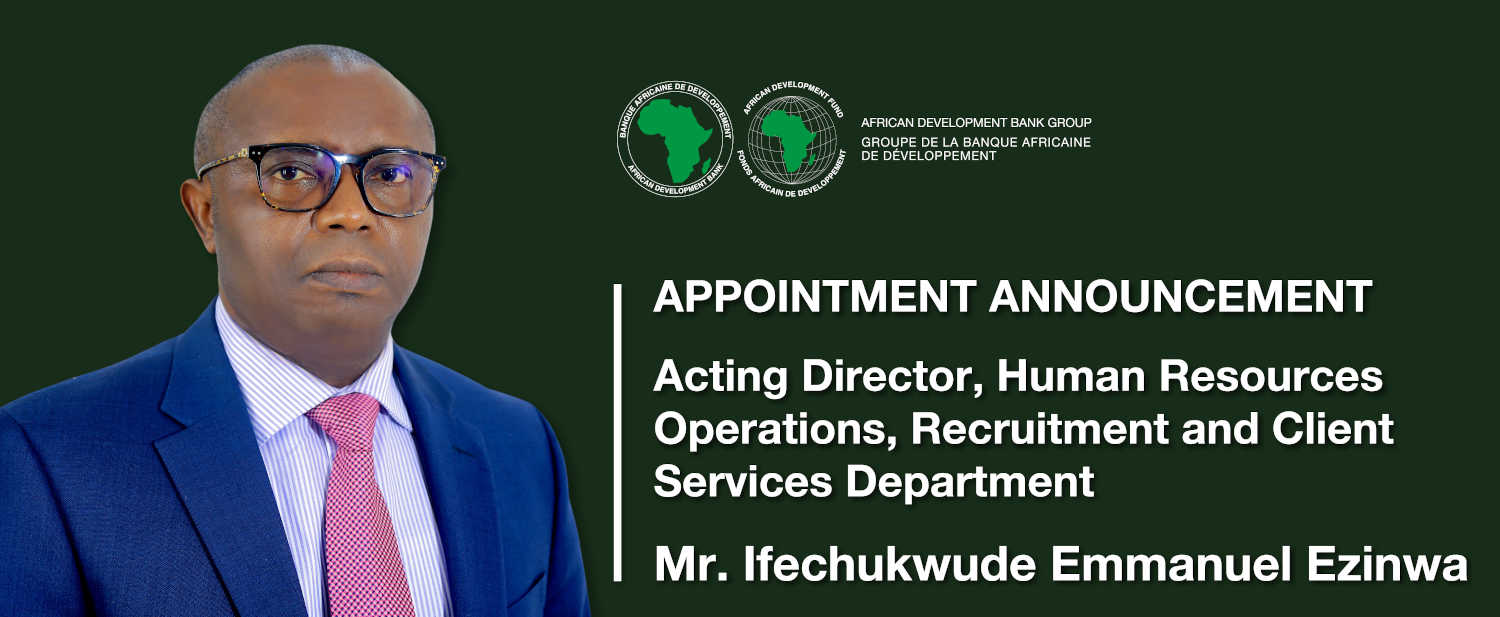 The African Development Bank Group has appointed Mr. Ifechukwude Emmanuel Ezinwa as Acting Director of the Human Resources Operations, Recruitment and Client Services Department, with effect from 1st July 2022.