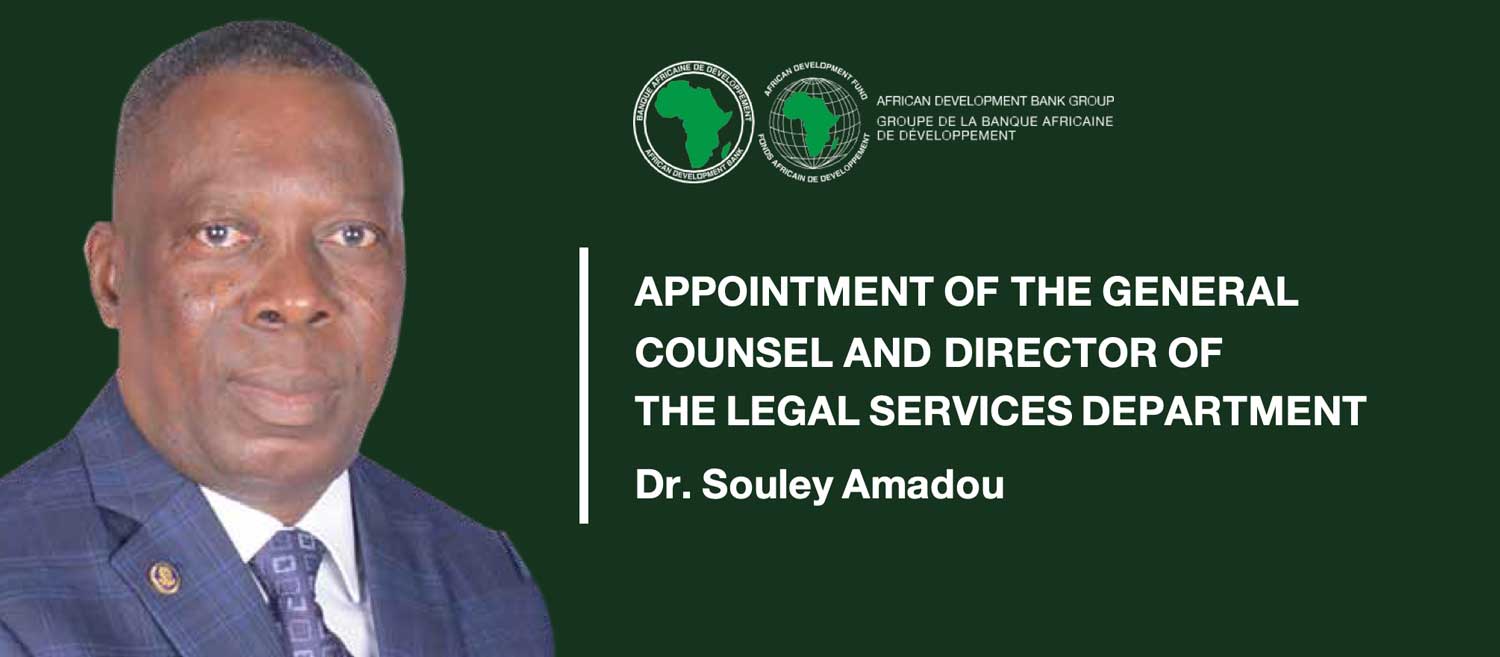 The African Development Bank is pleased to announce the appointment of Dr. Souley Amadou as General Counsel and Director of the Legal Service Department, effective 1st November 2021.