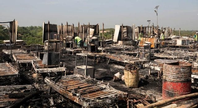 Pictures posted on social media show charred metal bed frames and workers clearing away piles of ash at the isolation and treatment centre for people with severe acute respiratory infections.