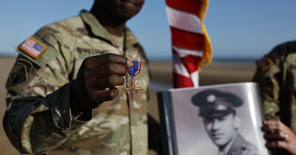 A medal richly deserved but long denied to an African American combat medic wounded on Omaha Beach in the D-Day landings has been tenderly laid on the hallowed sands where he saved lives and shed blood.