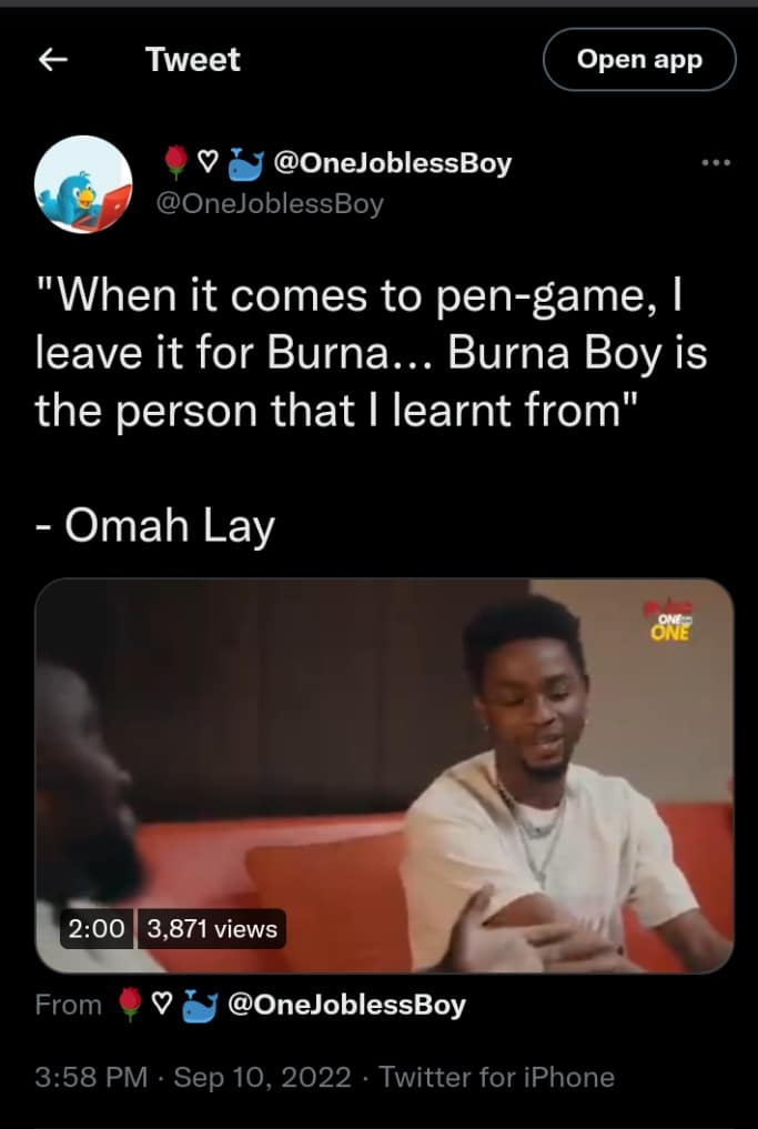 “When it comes to pen- game, I leave it for Burna …… Burna boy is the person that i learnt from”, he captioned the video.