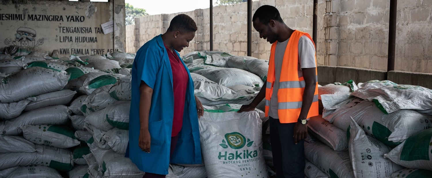 William Azalia, General Manager of Guavay, and his colleague controlling fertiliser stocks in one of their warehouses.