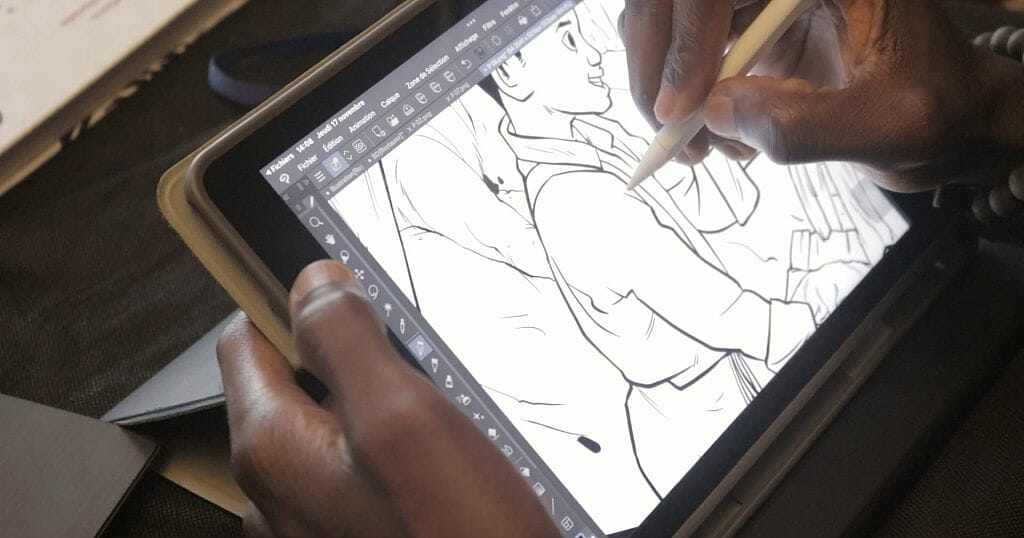 Artist Francky Mindja of the Legend Arts Studio is creating a new story called ‘Samba’s Handkerchief’ on his iPad.