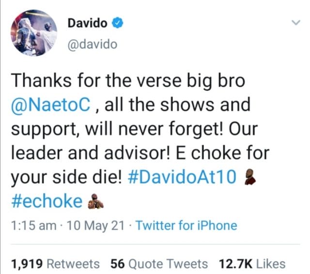 “Thanks for the verse big bro @NaetoC , all the shows and support, will never forget! Our leader and advisor! E choke for your side die! #DavidoAt10 #echoke“, he wrote.