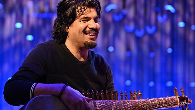 Homayoun Sakhi closes his eyes and runs his fingers along the long neck of his wooden instrument encrusted with mother-of-pearl.