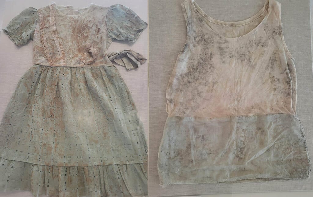 A toddler’s dress, and a five-year-old’s dress and sweater. Washed, cleaned, but still stained with blood.