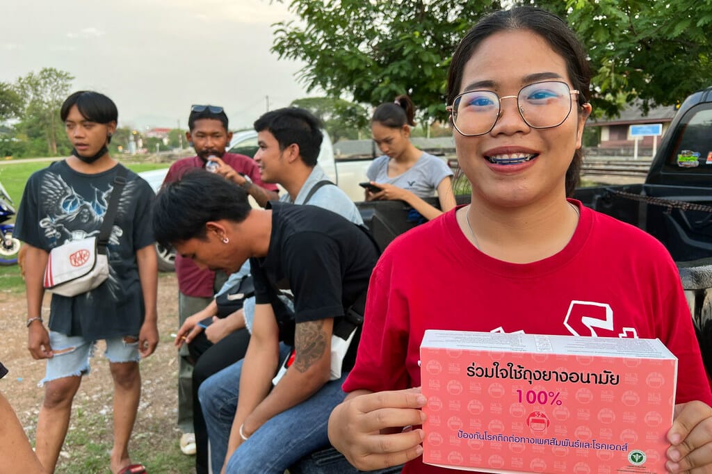 Baitoey , a peer educator for sexual and reproductive health, prepares to hand out condoms to a group of young men.