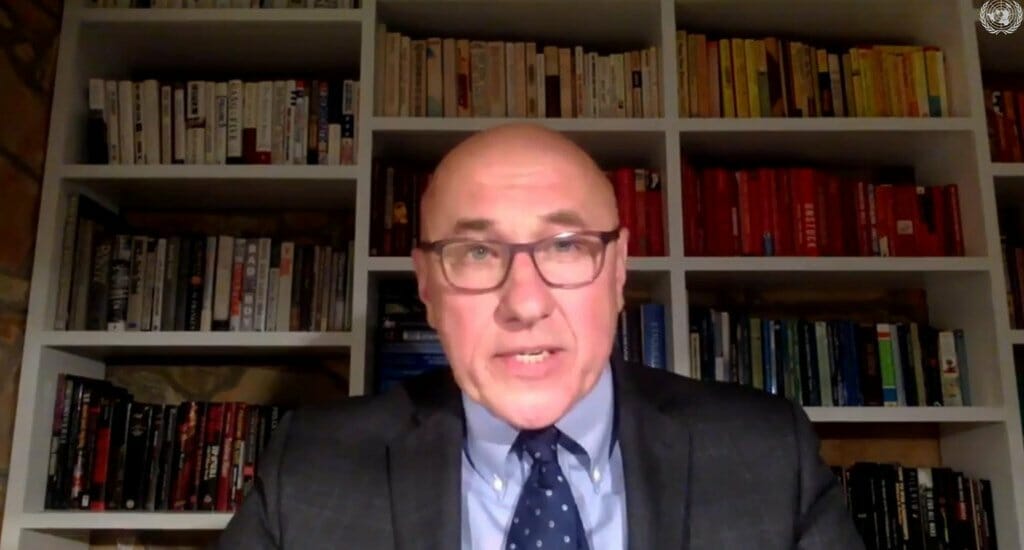 Thomas Andrews, independent human rights expert on Myanmar, gives a briefing via videoconference.