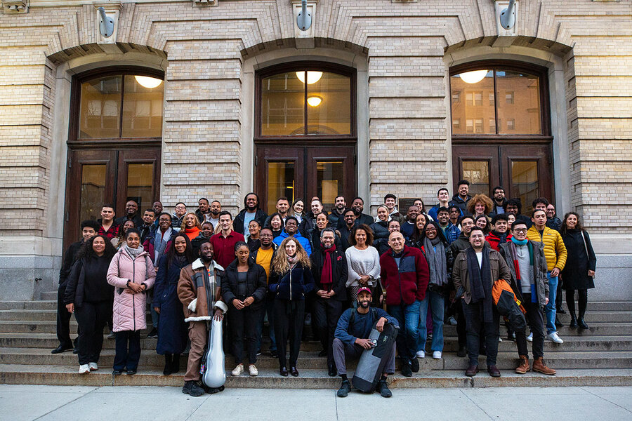 The members of Chineke!, Britain’s first majority-Black and ethnically diverse orchestra, stand for a group photo on the steps of New England Conservatory’s Jordan Hall, March 22, 2023, in Boston. Chineke! performed in Boston as part of its first North American tour.