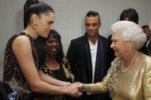 Queen Elizabeth II greets Jessie J and Robbie Williams backstage during the Diamond Jubilee Concert outside Buckingham Palace in London, on June 4, 2012. Dave Thompson/AFP/GI
