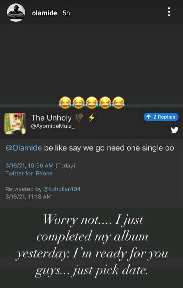 Popular indigenous rapper, Olamide Adedeji, has revealed that he has completed his new album to be released soon.