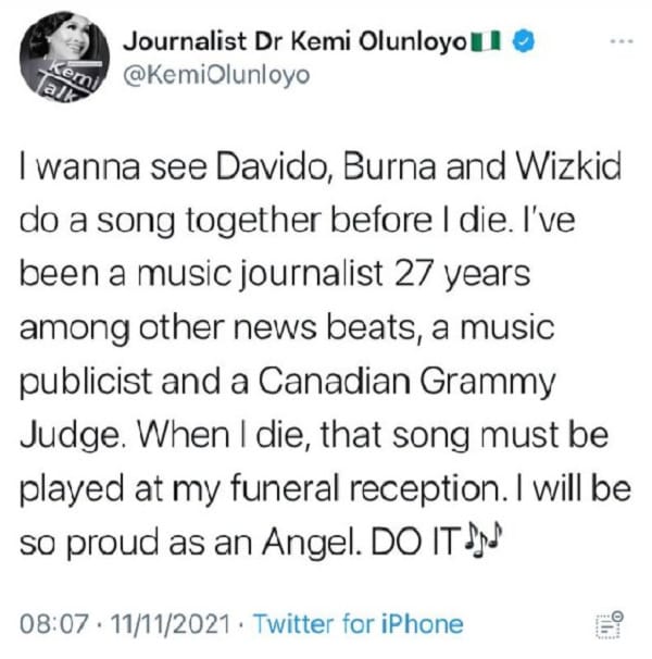“I wanna see Davido, Burna and Wizkid do a song together before I die. I’ve been a music journalist 27 years among other news beats, a music publicist and a Canadian Grammy Judge. When I die, that song must be played at my funeral reception. I will be so proud as an Angel. DO IT”. She tweeted.