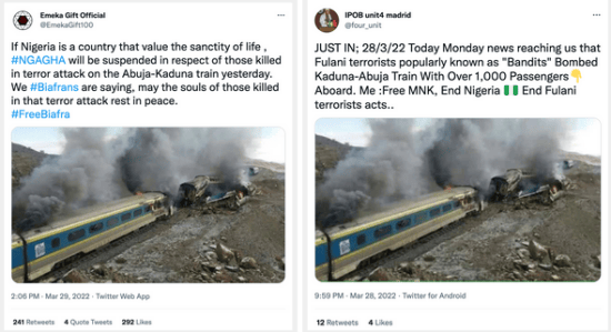 Sample social media posts showing the alleged train accident in Kaduna (left/ right) (Source:Twitter)