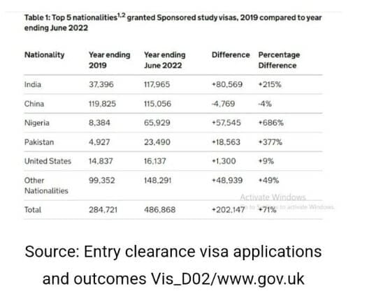 With the United Kingdom, most of the emigration to this country by Nigerians is for study and short visits. The United Kingdom is more friendly in accepting Nigerian students because of its close educational syllabus and curriculum. The number of study visas granted to Nigerians by the UK has risen from 9,355 in 2020 to 58,887 by March 2022.