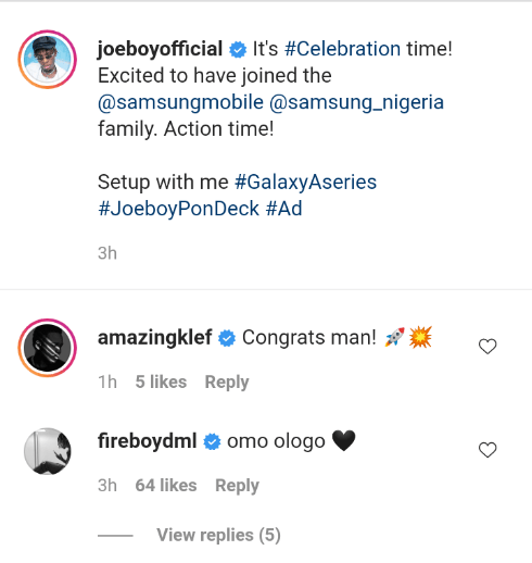 “It’s #Celebration time! Excited to have joined @samsungmobile @samsung_nigeria family. Action time! Setup with me #GalaxyAseries #JoeboyPonDeck“, he wrote as caption on Friday afternoon.