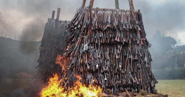The Kenyan President Uhuru Kenyatta on Wednesday presided over the burning of 5,144 illegal firearms and obsolete state-owned small arms and light weapons at the Regional Traffic Police Training Centre in Ngong, Kajiado County.