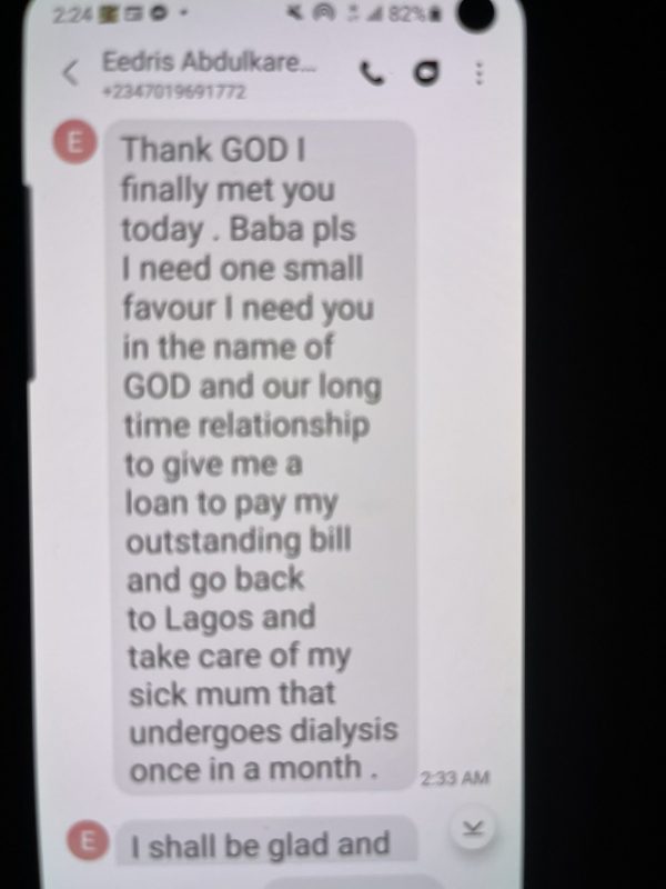 “In 2018, when I was named the Director of Strategic Communications for Buhari Campaign Organisation Eedris waxed a song in support of Buhari & wanted to join us, albeit for a fee. He then made desperate efforts to see me through text messages from his phone no. 07019691772.