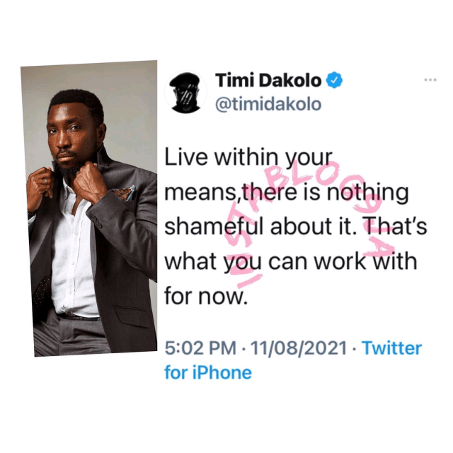 Nigerian singer, Timi Dakolo has advised his fans to live within their means as there is nothing shameful about it.