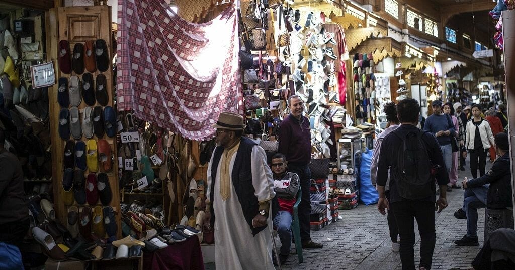Amid the hustle and bustle of ongoing trade, colorful clothes and accessories cover the walls, Gnaoua culture is on full display.