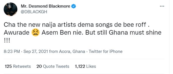 “Cha the new naija artists dema songs de bee roff. Awurade Asem Ben nie. But still Ghana must shine!” he wrote in a tweet dated, September 27, 2021.