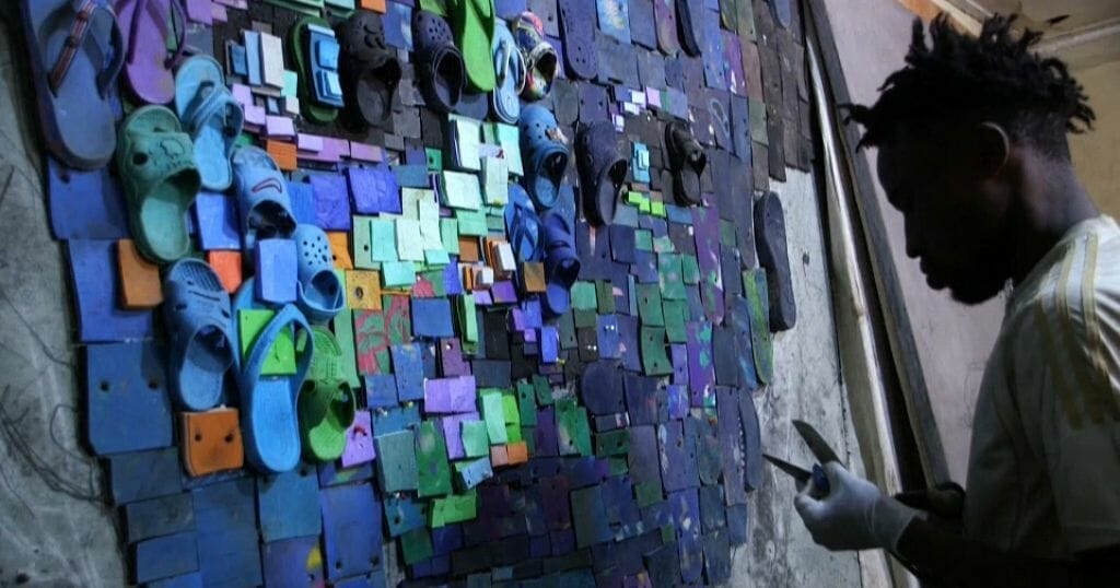 Both an artist and environmentalist, Konboye says recycling flipflops targets one of the worst plastic polluting items in Nigeria, Africa’s most populous nation, with more than 210 million people and growing fast.