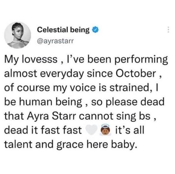 “My lovesss, I’ve been performing almost everyday since October, of course my voice is strained, I be human being, so please dead that Ayra Starr cannot sing bs, dead it fast fast. it’s all talent and grace here baby.”