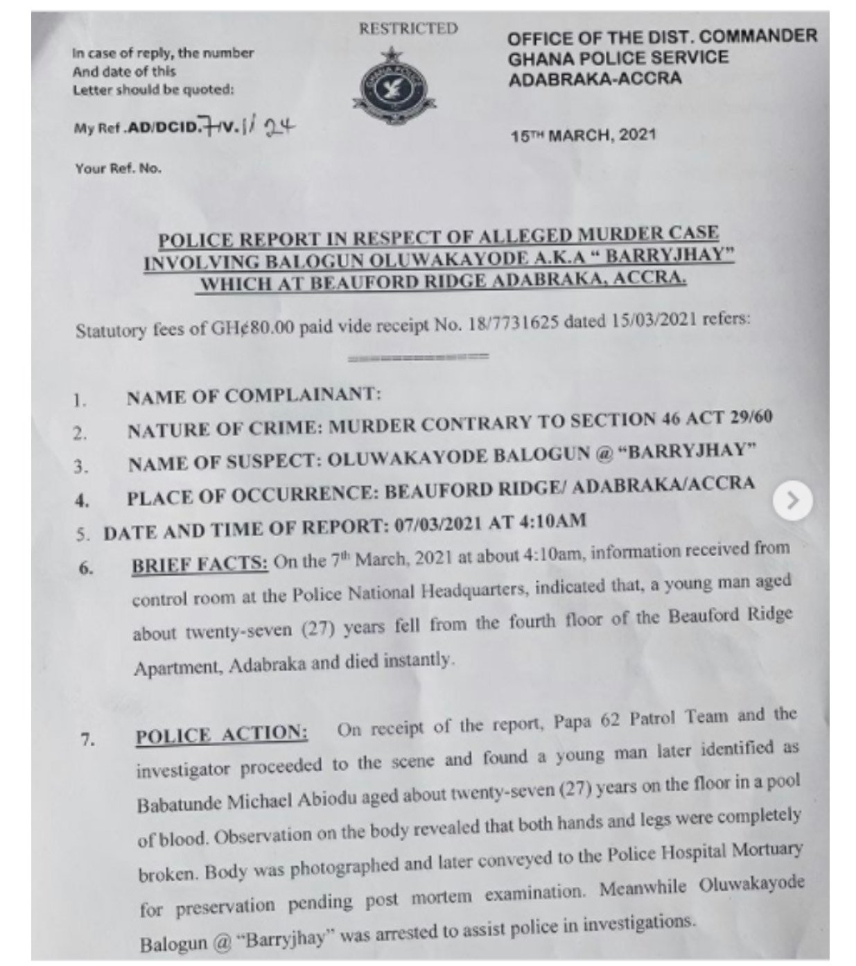 an investigation carried out by the Ghanaian police via his Instagram account