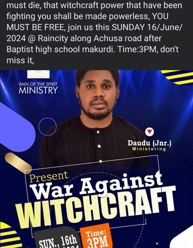 On his Facebook page, Daudu made it clear why state authorities should be concerned about the event. He stated: “WAR!!!!!!!! That witch that is tormenting your life must die, that witchcraft power that have(sic) been fighting you shall be made powerless, YOU MUST BE FREE, join us this SUNDAY16/June/2024@Raincity  along Achua road after Baptist High School, Makurdi. Time: 3 pm, don’t miss it”.