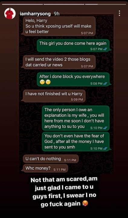 But in the screenshot he shared on his Instagram story, the blackmailer threatened to share the video, adding that she hasn’t finished dealing with the singer.