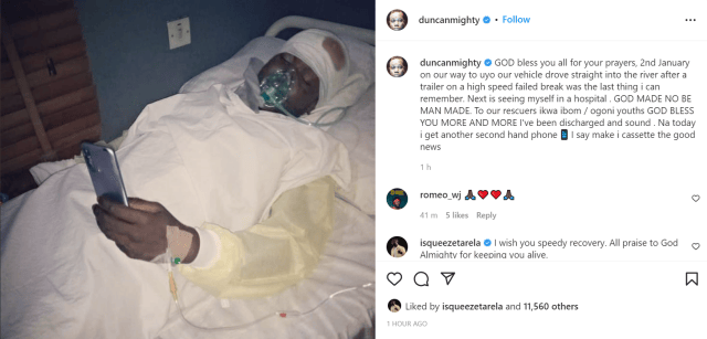 Nigerian singer, Duncan Mighty survived an accident that occurred on Sunday January 2, while on his way to Uyo.
