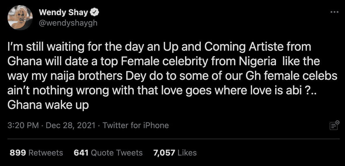 Wendy took to Twitter to claim that the dating scene is the same as Shatta Wale’s, who accused Nigerian celebrities of not supporting Ghanaian artists.