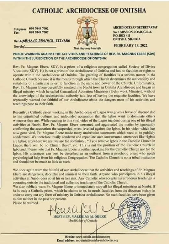 By Leo Igwe Humanists welcome a public warning by the catholic archdiocese of Onitsha against the ‘dangerous’ activities and toxic teachings of Rev Fr Magnus Ebere. A statement signed by the archbishop of Onitsha, Rev Valerian Okeke, described Fr Ebere as a priest of a religious congregation called Society of Divine, who deceitfully sneaked into Nnobi town in Onitsha archdiocese…