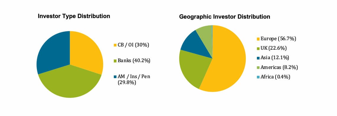 The geographical distribution highlights a diversified investor base approximately with the majority of the book from Europe (56.7%), followed by the UK (22.6%), Asia (12.1%), Americas (8.2%) and Africa (0.4%)
