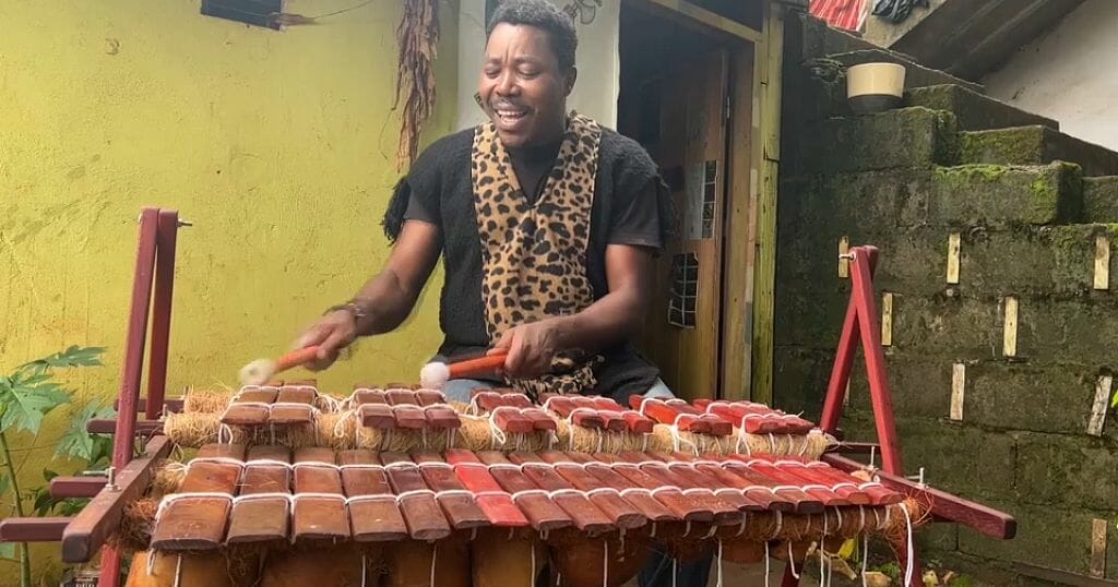 He plays an instrument that is a type of struck idiophone. Known as balafon, the sort of xylophone can be constructed of animal hors, skins and wood.