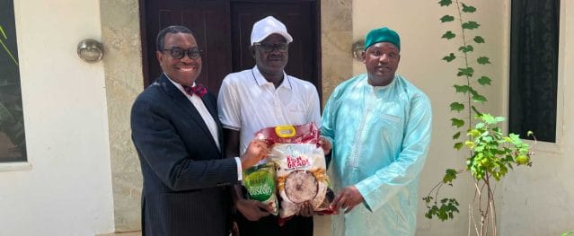Dr Adesina (left) and The Gambia President Barrow (right) with a local rice producer African Development Bank Group