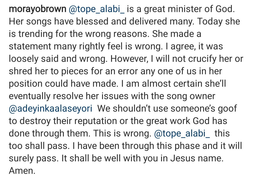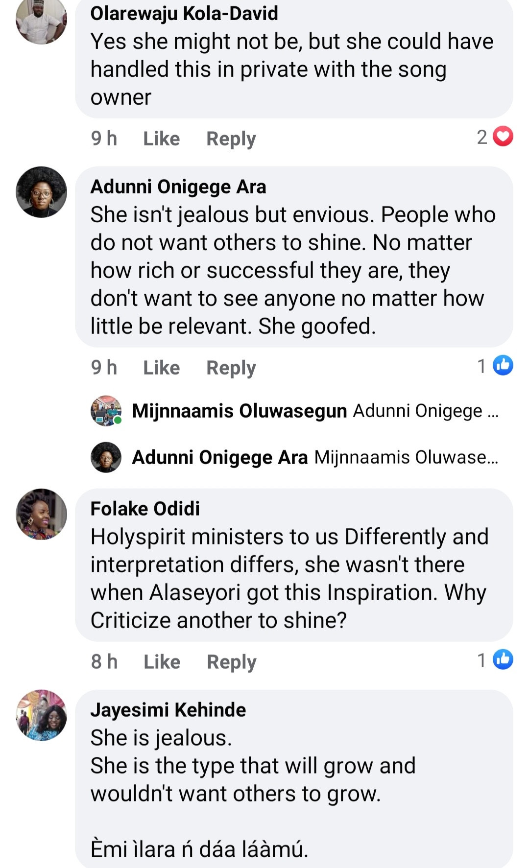 censure for criticising the song of a fellow gospel artist, Adeyinka Alaseyori.