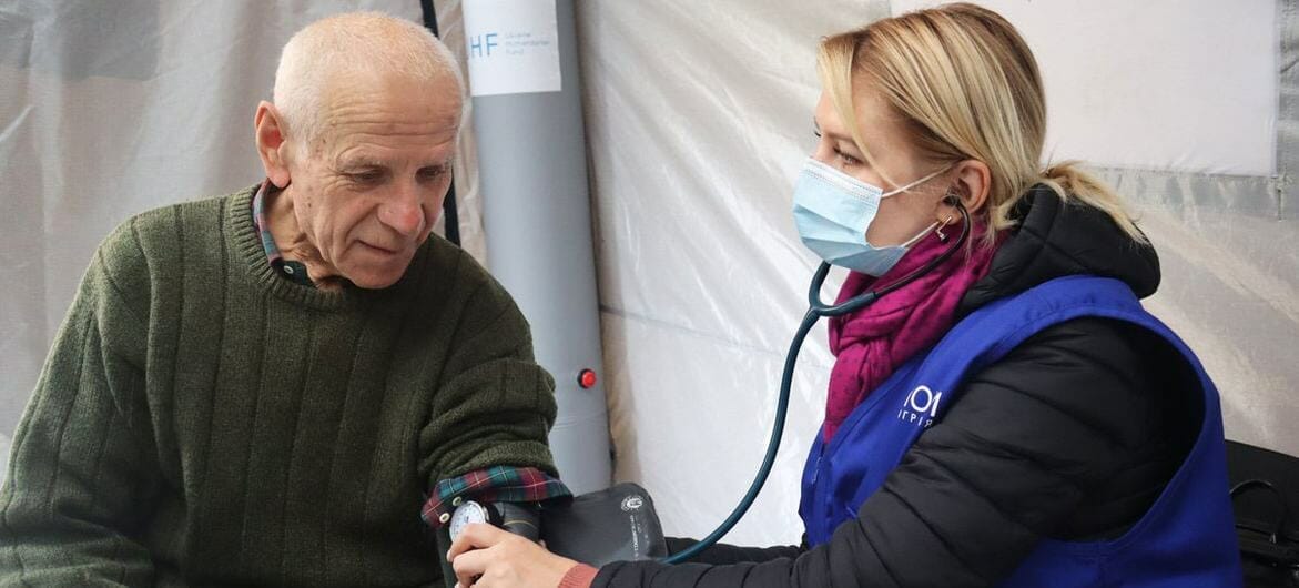 An elderly man receives comprehensive medical assistance at an IOM mobile clinic in a village in the Lviv region of Ukraine.